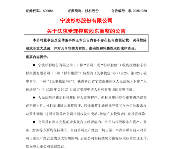 2025年2月25日,宁波鄞州区人民法院受理了中国建设银行宁波市分行、宁波鄞州农村商业银行宁穿支行和兴业银行宁波分行三家银行联合递交的对杉杉集团的重整申请。人们难以将眼前这家负债累累、被债权人围剿的企业,与那个中国服装业首家上市公司的杉杉集团联系起来。而杉杉集团之所以造成这个局面,与两年前其灵魂人物创始人郑永刚的突然离世,有着千丝万缕的联系。