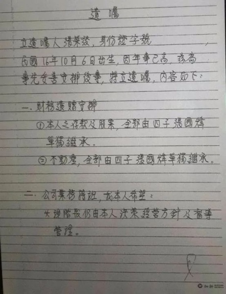 而对于父亲张荣发的遗产,兄弟之间没有停止争夺。2016年,大房三子张国政提起遗嘱无效诉讼,主张遗嘱中不是张荣发亲自签名,张荣发也未亲自指定2人以上见证,不符合遗嘱要件。张国炜则要求确认遗嘱效力并进行遗产分割。法院认为,张荣发生前虽反复住院,但根据见证人时任长荣集团总裁特助刘孟芬、集团监察人柯丽卿、总裁特助吴界源、法务执行长戴锦铨4人的证词,张荣发清楚知道遗嘱内容,并在签名后将遗嘱密封,足以证明张荣发当时意识清醒,具有制作遗嘱的能力。遗嘱上张荣发的签名,经进行笔迹鉴定,也系其亲自签署。张国政一方败诉后随即上诉。台湾高等法院维持了一审判决。张国政旋即又上诉至最高法院。2024年,最高法院判决确认张荣发遗嘱有效,其遗产在去掉遗产税及特留分后,140亿台币由张国炜继承。二房太太及大房子女每人继承20亿台币。
